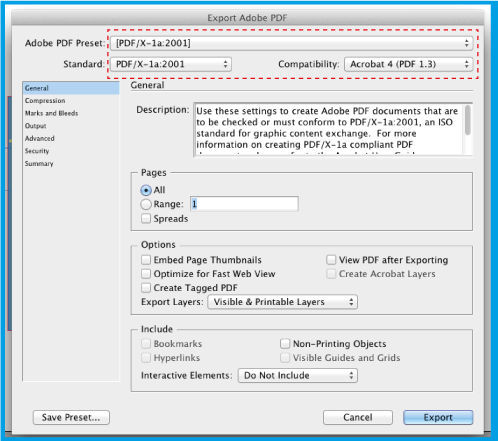 3.3 .In the window that opens, in Adobe PDF Preset select [PDF/X-1a: 2001] This option ensures that the PDF will not change.